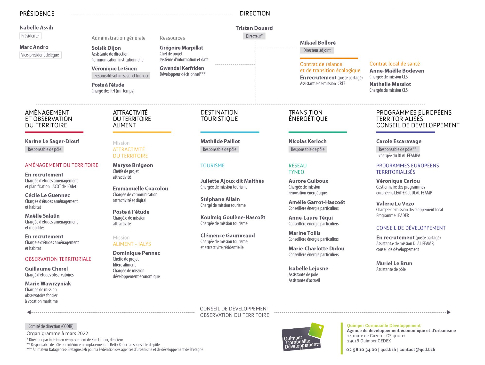 Quimper Cornouaille Développement compte 33 collaborateurs, répartis au sein de cinq grands pôles.