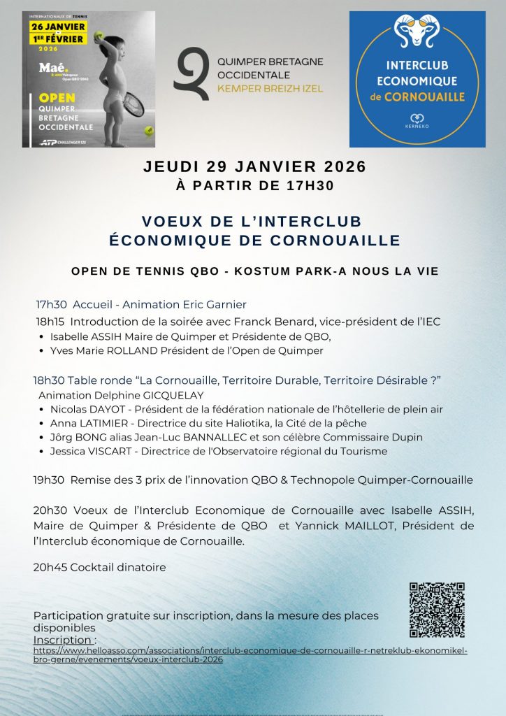 20h30 🔸Voeux de l’Interclub Economique de Cornouaille avec Isabelle ASSIH, Maire de Quimper & Présidente de QBO et Yannick MAILLOT, Président de l’Interclub économique de Cornouaille.