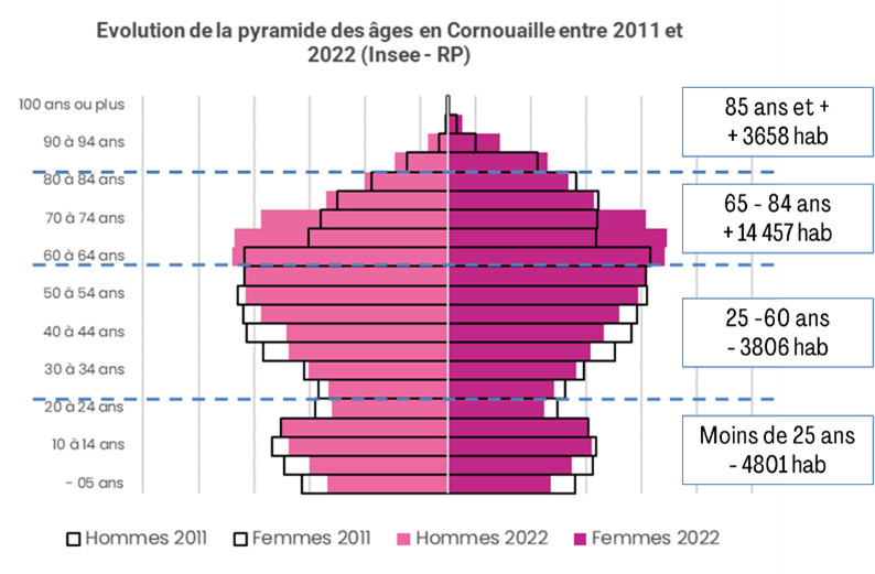 Le vieillissement de la population constitue un tournant démographique majeur, à l’échelle nationale comme en Cornouaille. Aujourd’hui, la majorité des habitants âgés de 65 ans et plus appartient à la tranche des 65-74 ans, souvent qualifiée de « retraités actifs ».