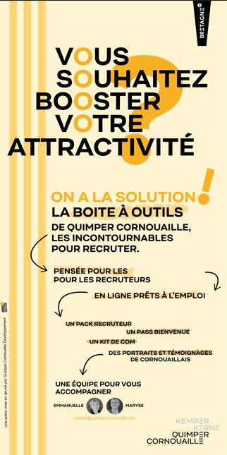 - Nourrir la démarche d’attractivité avec nos partenaires : la French Tech Brest Bretagne Ouest, la Technopole Quimper-Cornouaille, Quimper Bretagne Occidentale, la Région Bretagne…
